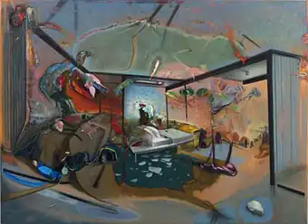 Schulz's early oil paintings arose out of the dislocation she felt following her parents' divorce and move to the alien suburban sprawl and tropical life of Florida.[18] These large works explore memories, charged emotions and relationship to place, using a recurrent, intimate metaphor of a house set in suburban landscapes to represent the human psyche.[16][18] In an effort to break from a single perspective format, Schulz reshaped styles and spatial treatments of the past—drawing on sources from Cezanne, Cubism and Giorgio de Chirico to traditional Chinese landscape painting and the early Renaissance (e.g., Giotto)—to create personal, contemporary statements.[16][18][21] They employ subtle shifts between maze-like interiors and suburban scenes to create fictionalized, cinema-like narratives, informed in part by her reading of Bachelard's phenomenological work The Poetics of Space.[16][18]