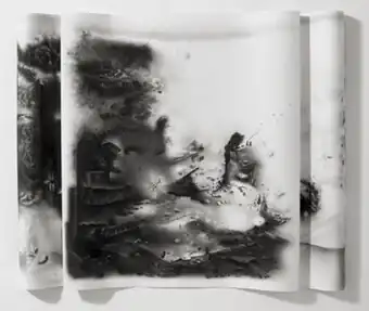 Beginning in 2005, Schulz shifted to large-scale, intricate charcoal drawings composed of multiple sheets that she often tore, folded, bent and distressed, reshaping and disrupting the picture plane.[32][5] These black-and-white works drew on diverse imagery and extensive reading, and increasingly, linked personal experience to collective, often-traumatic experiences, such as 9-11, Hurricane Katrina, and the assassination of Martin Luther King Jr.[32][1][25] They employ a careful blending of charcoal and delicate erasure that interweaves vignettes of haunted landscapes and elegant interiors intruded upon by war and natural disasters amid the folded terrain, low relief and untouched voids of the paper.[3][2][33]