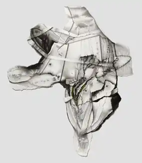 In her "The Impossibility of Keeping Borders" (2011–2) and "Incursion of Otherness" (2013–4) series,[35] Schulz explored crinkled textures and torn, irregular edges to a greater degree, while continuing to address historic upheavals like the Arab Spring through puzzling juxtapositions of desolate landscapes, buildings with semi-transparent walls, and elements such as miniature rowboats, beds, and penguins.[6][7] Her "Territory of Significance" (2015–6), "Groundlessness" (2017–8) and "Voyage" (2018–9) series[35] increasingly suggest maps, both through their irregular, continent-like shapes and mash-ups of deconstructed, varied terrains and settings spilling over and growing out of folds and bends in the paper.[38][39][40] Works such as An Early Map with No One to Say When the Ocean Begins or Traversing an Open Interior (both 2017) feature archaeological, geological and life forms seen from above suggesting timeless societal, environmental and internal processes taking place in a divided world.[12][40]