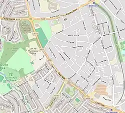 In the north on the east side are the Chicken Shed Theatre and Bramley Sports Ground. Opposite is the Cat Hill Chase Side Pond and one of the entrances to the housing development known as Bolingbroke Park on the former Middlesex University campus site. Mid-way along the road is the former Sir Thomas Lipton Care Home, aka Osidge House, on the west side. At the southern end is St Andrew's church, Southgate and the main Southgate shopping area. The road terminates at Southgate Circus adjacent to Southgate Underground Station.