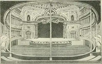 The theatre began quite humbly. In 1823 Hippolite Barrière, the manager of the Chatham Gardens in New York City, erected a white, canvas tent in his public pleasure grounds. He dubbed it the Pavilion Theatre and began staging drama there with a ticket price of 25¢.[1] The tent, which was used for other concerts and plays, also housed a saloon. The makeshift playhouse operated through the summer, perhaps the first such summer theatre in the United States.[2]