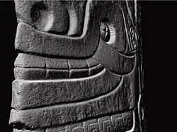Tello Obelisk is a vertical, rectangular shaft with a step-like notch at the top. The obelisk is carved in relief on all four sides and consists of two representations of a single-type creature. The head, body and tail occupy one or the other broad sides, while the legs, genitalia and other subsidiary elements occupy the narrow sides. These creatures have been interpreted as a "cat-dragon" type of creature (by Tello) and as a cayman (by Rowe and Lathrop).[19] The large artifact may portray a creation myth.