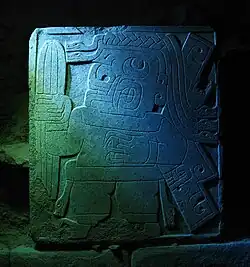 Some other iconography found in Chavín art continues to give a glimpse as to what the culture was like, such as the general evidence of the use of psycho-active plants in ritual. The San Pedro Cactus is often seen on various art forms, sometimes being held by humans, which is used as evidence to support the use of the plant.[16] The stone sculpture stela of the cactus bearer shows an anthropomorphized being with serpent hair, a mouth with fangs, a belt with a two-headed serpent and claws, who in their right hand holds what appears to be a San Pedro cactus.[17]