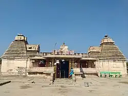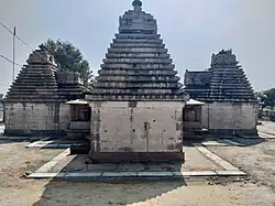The main trikuta temple shares a mandapa (pilgrim hall). Each side of the three-sanctum temple is an austere cube with plain walls. On each is a phamsana-type vimana superstructure, one of many types of Hindu temple architecture described in Sanskrit texts. Each cube has a nominal adhisthana of the manchabandha class, while on top of the vimana is the Dravida-ghanta, a feature so named in the Aparajitaprccha, an Indian Vastu Sastra text.[3]