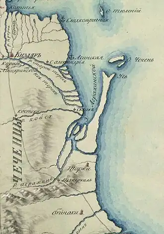 One of the islands first mentions was around 1500 under the name sicamatela on an Italian map. The island is named after the Chechens. According to the Russian geographer and military man, the Chechens were previously settled up to the sea.[4] German explorer Samuel Gmelin, who visited the area up until 1774, mentions how Chechens would go fishing on the island.[5]