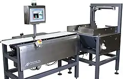 A checkweigher is an automatic or manual machine for checking the weight of packaged commodities. It is normally found at the offgoing end of a production process and is used to ensure that the weight of a pack of the commodity is within specified limits. Any packs that are outside the tolerance are taken out of line automatically.[1][2]