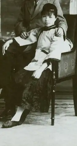 Chen was born in Changsha, Hunan, in 1902, the start of the final decade of the Qing Dynasty.[1][2] She was raised in a poor but literate family, and began binding her feet at a young age, per custom. She did not complete her foot binding, but her feet remained "a little bit crooked". As a young girl, she foraged for brushwood in the countryside.[3]: 71  At age 12, she left her family to live with the Ren family, as her family had promised her in marriage to them as an infant.[1] At age 14, she began working in a local factory which produced socks to help pay for her betrothed's education;[4] here she was introduced to the working conditions of "China nascent working class".[5]