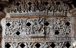 The fifth carved band is of small figurines, mostly females with various expressions facing the viewer, while periodically the band includes Yakshas who face towards the inside of the temple. This layer also has numerous dancers and musicians, as well as professionals with their tools.[38][39] The band above has pilasters between some of which are carved secular figures mostly females and couples. A nature and creepers band wraps the temple above the pilaster band, with scenes of the Ramayana epic included in this band. Above this layer are scenes from common life depicting kama, artha and dharma. Included here are couples in courtship, eroticism and sexual scenes, followed by couples with children, economic and festive activities.[38] Towards the north outer wall, friezes with scenes from the Mahabharata are portrayed.[38]