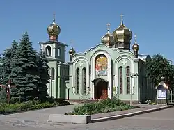 - Castle Hill (Hill of Glory). The memorial complex with a monument "Motherland" is located at the top of the former Castle Hill. At this point, ancient Cossack fort, remains of Cherkasy fortress and Holy Trinity Church were situated. In 1977 all architectural and archaeological sites were completely destroyed during construction of the monument, although the new Holy Trinity Cathedral was constructed nearby.[26] From the top of the hill a panoramic view opens on the Kremenchuk Reservoir.