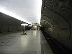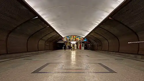 Cherkizovskaya opened in 1990 and was the work of architects V. Cheremin and A. Vigdorov. The station is named after the former village of Cherkizovo which is a district of Moscow nowadays. The design of the station is a single vault, with a curved ceiling and a platform free of pillars. The outer walls are faced with panels of corrugated metal. Both ends of the platform are decorated with stained-glass panels above the exit stairs.[2]