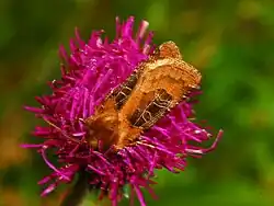 Adult males have a wingspan of 32–36 millimetres (1.3–1.4 in); adult females have a wingspan of 33–39 millimetres (1.3–1.5 in). This species shows a high variability in the basic colors. Usually, the upper side of the forewings is coppery reddish brown (hence the Latin name cuprea) with dark brown markings that have a thin whitish border. The underside of the forewing is dark gray-brown. The hind wings are monochrome gray-brown. Caterpillars are gray-brown, with dark dorsal markings and bright side stripes.[1] Warren (1914) states R. cuprea Schiff. (= haematitedea Esp.) that the forewing is a dull brown; the median area below the subcostal vein is dark brown; the veins and edges of stigmata are very finely pale; the stigmata are a deep brown; the costa is dark with fine pale speckling and a dark shade before the submarginal line; the hindwing is gray-brown with a yellowish fringe. The species in found in Northern Europe (excluding Britain), Armenia, and Kamschatka. The larvae are dull brown, with 3 whitish dorsal lines, some oblique black subdorsal streaks, and a grey lateral line; The larvae live on various low plants.[2]