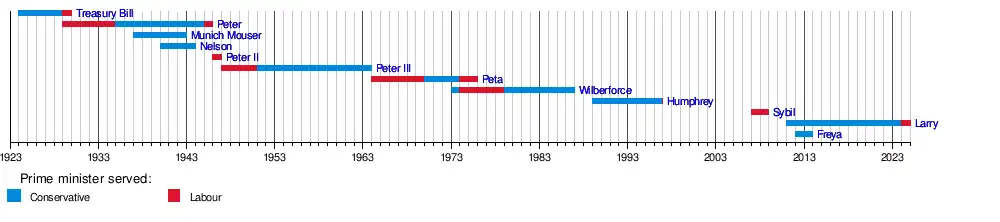 | Larry | 2011 | current | David Cameron, Theresa May, Boris Johnson, Liz Truss, Rishi Sunak, Keir Starmer | [32] |
