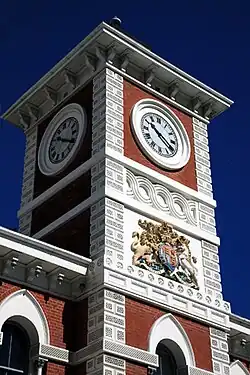 Reputed to be a replica of London's Great Clock of Westminster,[8][29] a working, free standing, four faced turret clock was installed in 1879 within a clock tower.[30] Underneath the east facing clock face is the Royal coat of arms of the United Kingdom.[12] Notable for being unreliable, an electric clock was eventually installed to control the visible faces as slave clocks. While at one time it chimed on the hour and at the quarters,[31] after the mechanisms were damaged in a 1980s fire, the clock became silent.[8]