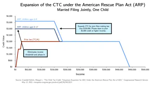 The child tax credit has a significant effect on child poverty. In 2016, it was estimated to have lifted about 3 million children out of poverty.[7] In 2021, a Columbia University study estimated that the expansion of the CTC in the American Rescue Plan Act reduced child poverty by an additional 26%, and would have decreased child poverty by 40% had all eligible households claimed the credit.[8]