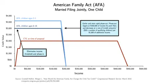 In 2017, Democratic senators Michael Bennet and Sherrod Brown proposed the American Family Act (AFA).[47][48] The bill would have increased the child tax credit's refundable portion to $3,600 per child under age six and to $3,000 per child age six to 16, eliminated the income threshold and phase-in (opening up the credit to the lowest-income families), and made the credit a monthly rather than annual benefit.[47]
