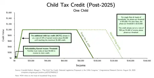 The $2,000 child tax credit instituted by the Tax Cuts and Jobs Act of 2017 (TCJA) is scheduled to expire in 2025. Under the One Big Beautiful Bill Act, the tax credit was increased by 10% to $2,200 in 2026 and is adjusted for inflation annually. The refundable portion reverted to its 2022 amount of $1,400, although it is adjustable for inflation. The income phaseout has been fixed at $200,000 ($400,000 for married filing jointly) and will not be indexed for inflation. The taxpayer and the eligible child must have a work-eligible Social Security number which is estimated to remove approximately 4.5 million children from eligibility who are in mixed-status families.[17]