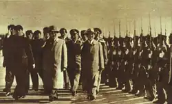 The People's Republic of China established diplomatic relations with Mongolia on October 16, 1949, and both nations signed a border treaty in 1962.[14] With the Sino-Soviet split, Mongolia aligned itself with the Soviet Union and asked for the deployment of Soviet forces, leading to security concerns in China.[15] As a result, bilateral ties remained tense until 1984, when a high-level Chinese delegation visited Mongolia and both nations started to survey and demarcate their borders. Mongolian General Secretary Jambyn Batmönkh, during a meeting with President Kim Il sung while on a state visit to Pyongyang in November 1986 states that "renewing the development of China-Mongolian relations is important for our two countries’ people's common interest".[16] In 1986, a series of agreements to bolster trade and establish transport and air links was signed.[15] In 1988, both nations signed a treaty on border control.[17] Mongolia also started a more independent policy and pursued more friendly ties with China.[15]