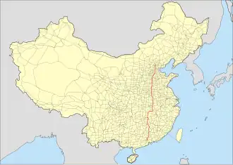 It leaves Beijing at Yuquanying and heads to Gu'an County, Bazhou (Hebei), Kaifeng (Henan), Ezhou (Hubei), and eventually Guangzhou (Guangdong) on the south China coast.