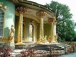 The Chinese House (German: Chinesisches Haus) is a garden pavilion in Sanssouci Park in Potsdam, Germany. Frederick the Great had it built, about seven hundred metres southwest of the Sanssouci Summer Palace, to adorn his flower and vegetable garden. The garden architect was Johann Gottfried Büring, who between 1755 and 1764 designed the pavilion in the then-popular style of Chinoiserie, a mixture of ornamental rococo elements and parts of Chinese architecture.[1]