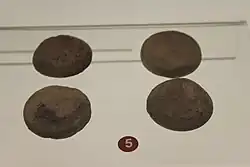 Clay versions of the Warring States era Kingdom of Chu gold plate money (泥「郢稱」(楚國黃金貨幣); 泥"郢称"(楚国黄金货币); ní "yǐng chēng" ( chǔ guó huáng jīn huò bì )) are sometimes found buried in tombs of the late Zhou dynasty era, known as the Warring States period and even during later periods such as the Han dynasty.[5] At the Mawangdui archaeological site over 300 pieces of this clay replicas of Ying Yuan were discovered.[5]