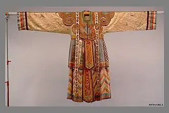 Xifu (Chinese: 戏服; pinyin: xìfú), also known as Chinese opera costume in English, are the stage clothes and attire worn in Chinese opera, such as Kunqu, Cantonese opera, Beijing opera, Huangmei opera.[1] Some of these costumes bear some resemblance to the Hanfu system but also show some differences in terms of clothing ornaments and decorations, as well as colour system, and in design and construction.[1] In 2006, the techniques used to produce Beijing opera costumes were included in the national intangible cultural heritage list.[2]