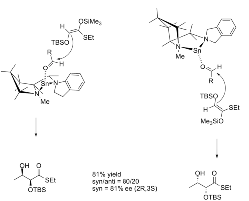 In the aldol reaction, the diastereoselectivity of the product is often dictated by the geometry of the enolate. The Zimmerman–Traxler model predicts that the Z enolate will give syn products, and that E enolates will give anti products. Reactions catalyzed by tin-based CLAs allow products to deviate from this pattern.[9]