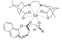 The Baylis–Hillman reaction is a route for C-C bond formation between an alpha, beta-unsaturated carbonyl and an aldehyde, which requires a nucleophilic catalyst, usually a tertiary amine, for a Michael-type addition and elimination. The stereoselectivity of these reactions is usually poor. Lanthanum(III)-containing CLAs have been demonstrated to improve stereoselectivity. Similarly, a chiral amine may also be used to achieve stereoselectivity.[10]
