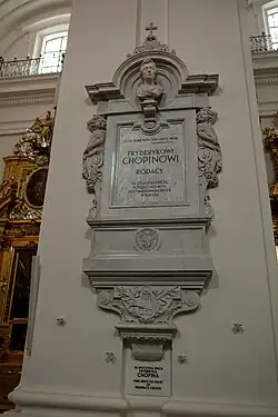 Chopin's heart arrived in Warsaw and was kept by his sister and mother, resting on top of a dresser at the home of Jędrzejewicz and the Kalasanty family.[5] Prior to Jędrzejewicz's death in 1855, she may have arranged for the transfer of the heart to Warsaw's Holy Cross Church. There was opposition within the church's clergy to having the heart in the upper part of the church, as Chopin was not a saint.[5] Instead, the heart was tucked away in the church's catacombs and lay there undisturbed and unlabeled for over two decades. In 1878, journalist Adam Pług found the heart in a box and wrote about his discovery in a Warsaw journal.[9]