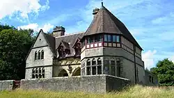 The house is built of gritstone, and has a red tile roof with crested ridge tiles, a lead pinnacle and a finial. It has two storeys and three bays. On the front, the middle bay is recessed, and contains a portico with two chamfered slightly pointed arches, over which are carved shields and a badge, and two dormers with curved bargeboards. The left bay is gabled, and contains a four-light mullioned and transomed window and a three-light mullioned window above. The right bay projects and is canted; the upper floor is timber framed. At the rear, on the left, is a large timber framed gable approached by external stone steps, and to the right is a two-storey tower with a pyramidal roof. The front wall has chamfered coping, and it contains a gateway with three steps.[2][4]