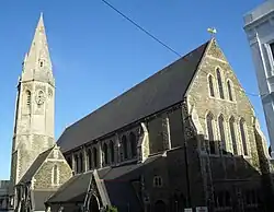 Christ Church is an Anglican church in the town and seaside resort of St Leonards-on-Sea, part of the Borough of Hastings in East Sussex, England. Opened as the town's third Anglican church in 1860 to serve a rapidly developing residential area and to accommodate poor worshippers who could not afford pew rents at the fashionable St Leonard's and St Mary Magdalene's Churches, the original building was superseded by a much larger church built next to it between 1873 and 1875. Prolific ecclesiastical architect Sir Arthur Blomfield's simple Gothic Revival design forms a landmark on one of St Leonards-on-Sea's main roads, continues to serve a large area of the town (including the former parish of the now closed St Mary Magdalene's Church) and maintains a strong Anglo-Catholic tradition. It has been described as Blomfield's "finest achievement in Sussex" and "one of the main centres of Anglo-Catholic worship in Southern England".[1] The interior fittings are the best of any church in the borough, and the design has been called one of Blomfield's most successful.[2] St John the Evangelist's Church, founded as a daughter church nearby in 1865, also continues to thrive as a separate parish church. Historic England has listed Christ Church at Grade II* for its architectural and historical importance.