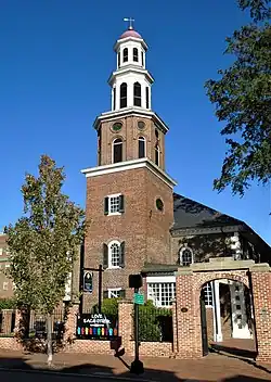 The Anglican congregation that commissioned the church's construction was founded in 1765, when Fairfax Parish was established. The vestry commissioned the construction of two churches, this one, and another at Falls Church. The architect of both buildings was by Colonel James Wren. To finance construction of the church in Alexandria, the vestry raised 31,186 pounds of Oronoco tobacco from parishioners. Construction began in 1765, under the direction of James Parsons. After four years, the church was still unfinished. The vestry relieved Parsons of his duties as overseer of the construction. John Carlyle accepted the position and handed the keys of the completed building over to the vestry in February 1773. During the Revolutionary War, the church was a center of pro-revolutionary activity, with its Rector, David Griffith, being particularly outspoken in favor of independence. After independence, the church survived the disestablishment of the Church of England as the state church of Virginia by the Commonwealth, in large part thanks to private support from parishioners including George Washington.[5] The church is distinctive among Virginia's colonial churches in that its interior was spared the ravages of the Civil War. However, it was occupied by Union troops, and most of the tombstones were lost over the course of the war along with the church's silver. In the winter of 1869 – 1870, following the Civil War, Christ Church established Meade Memorial Chapel as a mission church in the north end of Alexandria.[4]