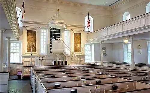 Initially the pews were box pews and a two-tier pulpit was situated on the north side of the sanctuary. There was no font because until after the Civil War, weddings, baptisms, and the churching of women took place at home. In the mid-nineteenth century, stoves were put in the back of the church and the box pews were converted to the slips that are in use today. During a renovation later that century, the original pulpit was replaced by the current wine-glass pulpit. The only remaining hand-carved hymnal rack is in the Lee pew. The chancel is decorated on both sides with hand-lettered plaques displaying the Decalogue, the Lord's Prayer, the Apostles' Creed, and the Golden Rule. These plaques are original to the church, and painted by James Wren.