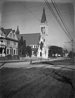 Early 20th-century photo of the church with the original steeple, which was destroyed in the Great New Orleans Hurricane of 1915