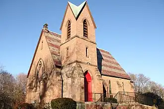 Christ Episcopal Church is a historic Episcopal church located in Marlboro, Ulster County, New York. The church was designed by architect Richard Upjohn and built in 1858 in the Gothic Revival style. It is built of dark red brick with contrasting brownstone detailing. It features a square entry tower and polygonal apse with steeply pitched roofs, with polychrome slate shingles on the main section. It also has a notable collection of stained glass windows designed by D. Maitland Armstrong (1836-1918). Also on the property is the church rectory (1863) and cemetery, with burials dating before 1840.[2]