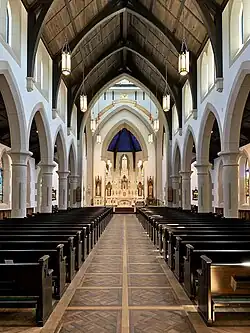 On the east side of the building is the Lady Chapel, which is dedicated to Mary. The stained-glass windows inside this chapel depict Mary's Annunciation, Visitation, Assumption, and Coronation. There is also a painting of Mary and Joseph's wedding and a carpet from the House of the Virgin Mary, a Catholic shrine near Ephesus, Turkey.[4]