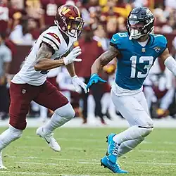 On March 16, 2022, Kirk signed a four-year, $72 million contract with the Jacksonville Jaguars.[32] In his Jaguars debut, Kirk had six receptions for 117 yards in the 28–22 loss to the Washington Commanders.[33] In the following game, he recorded two receiving touchdowns in the 24–0 victory over the Indianapolis Colts.[34] In Week 10, against the Kansas City Chiefs, he had nine receptions for 105 yards and two touchdowns in the 27–17 loss.[35] In the 2022 season, Kirk achieved career-highs with 84 receptions, 1,108 receiving yards and eight touchdown receptions.[36] Kirk scored receiving touchdowns in both of the Jaguars' postseason games.[37][38]
