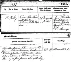 3. ^ Christian Mortensen's birth record (see image) shows his birthplace as the village of Skaarup, Denmark, which was located in Fruering Sogn (parish), Hjelmslev Herred (Hundred), Skanderborg county, which is now part of Skanderborg municipality.