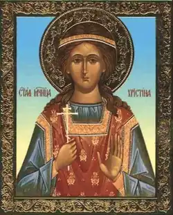Christina is commemorated on 13 March in the Catholic Church and the Syriac Orthodox Church.[2] The Roman Martyrology describes her as follows: "In Persia, Saint Christina, martyr, who was flogged with rods and concluded the witness of martyrdom under King Chosroes I of the Persians."[6] In the Georgian Orthodox Church, her feast day was 15 March in the early 7th century. Some versions of the 10th-century church calendar of Ioane-Zosime, however, give it as 14 March.[7] The Synaxarion of Constantinople of the Eastern Orthodox Church also gives 14 March.[2]