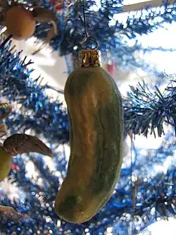 This tradition is commonly believed by Americans to come from Germany and be referred to as a Weihnachtsgurke (German for "Christmas pickle"),[6][7] but this is probably apocryphal.[8][6][1] It has been suggested that the origin of the Christmas pickle may have been developed in the 1890s to coincide with the importation of glass Christmas tree decorations from Germany. Woolworths was the first company to import these types of decorations into the United States in 1890,[6] and glass blown decorative vegetables were imported from France from 1892 onwards.[9] Despite the evidence showing that the tradition did not originate in Germany, the concept of Christmas pickles has since been imported from the United States and they are now on sale in the country traditionally associated with it.[6]