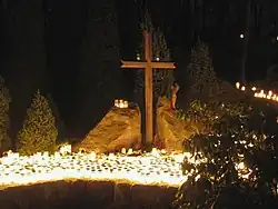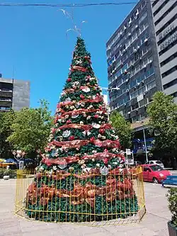 In addition to traditional Christmas decorations, it is common among Uruguayan Christians to put up a balcony banner with an illustration of the nativity scene that reads "Christmas with Jesus".[46] These banners were launched in 2016 as part of a campaign carried out by the Catholic Church in Uruguay to "raise awareness about the true meaning of the holiday" in a highly secular country.[47] Pope Francis welcomed the initiative and was photographed with one in the Vatican City.[48]