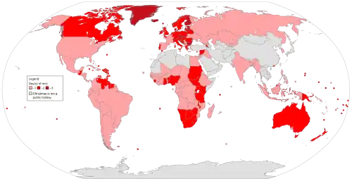 Christmas is observed widely on 25 December. Governments recognizing the holiday include those of the United States, where it is a federal holiday for federal employees and a legal holiday in the respective states; Canada, where it is a nationwide statutory holiday; Mexico, where it is also a nationwide statutory holiday; and several others.