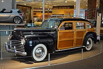 During the 1948 model year, while the 1948 Town & Country 4-door sedan was in its last model year of production ever after only a three-model-year production run (since the 1946 model year), the 1948 Town & Country 2-door convertible carried over with just very few improvements over the previous model year (1947). This was also the year the genuine Honduran mahogany wood panels were replaced by DI-NOC vinyl panels.[5] A similar appearance sedan was also introduced in 1948 called the Packard Station Sedan which appeared like a sedan but had a two-piece tailgate constructed entirely of wood.[5]