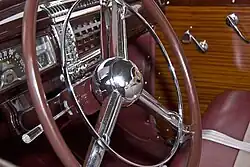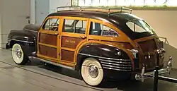 After World War II, the Town & Country nameplate returned, though the 4-door 8-passenger station wagon did not. Only the 1946 Town & Country 4-door sedan and the 1946 Town & Country 2-door convertible were offered; however, the 1946 Town & Country sales brochure also described and illustrated a roadster, a 2-door sedan called the Brougham, and a 2-door hardtop called the Custom Club Coupe.[3] None of those three additional body styles progressed beyond the prototype stage, with one Brougham and seven Custom Club Coupes built;[4] it would be another three model years before General Motors would offer the first mass-produced 2-door hardtops, while the Town & Country range would not see a production 2-door hardtop until one model year after that. The wooden body framing was made from white ash and the panels were mahogany veneer but were now bonded to steel body panels.[5] The average retail price was listed at US$2,609 ($42,069 in 2024 dollars [2]) and production totals were documented at 2,169.[5]