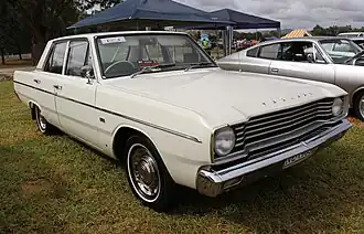 The VE Valiant was larger than any previous Valiant model.[1] Styling was based on that of the U.S Dodge Dart and Plymouth Valiant models with no body panels carried over from the VC Valiant. While the styling from the A-pillar back was Australian-influenced, sheeting forward of the A-pillar and bonnet was that of the U.S. Dart/Valiant models with the exception of the grille which was convex on the Australian models as opposed to concave on the U.S. models.[6] Also new in the VE range were dual-line brakes, double-sided safety wheel rims, front safety belts and power-assisted front disc brakes on V8 models.[1] The Valiant VIP (four-door performance model) was offered for the first time,[1] the new model featuring the V8 engine, automatic transmission, power steering, front disc brakes and reclining front seats.[6]