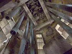 The three-stage, circular bell tower on the south-west corner of the church is attached to the building,[1] but appears from some viewpoints to stand separately. The long first stage has lancet windows at the bottom, and quatrefoil windows level with the nave roof. The first and second stages are divided by a sloping course supported by bud corbels and surmounted by four trefoil gablets, or small decorative gables, set above the four quatrefoil windows. The second stage is the belfry originally designed for a single bell, and this has lancet windows with decorative wooden louvres or abat-sons. The spire is built of stone laid in decorative bands.[1] It now contains a carillon of eight tubular bells donated in 1914 by the family of Melville M. Walker, controlled at ground level by an Ellacombe chiming rack. There is no public access to the tower.[14]