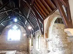 There are two tiny transepts, and the entrance of each is supported by a central pillar dividing arches echoing the design of the chancel arch and its pillared corbels. Above the transept windows and west windows are ventilation slits which are now glazed: a reminder that this is a cemetery chapel. One window of the south wall and two windows on the north wall of the nave contain stained glass. When the building was listed in 1975 it still had the original stained deal pews, but during the restoration of 2014 some of these were removed, and some were stacked in the chancel.[1] The Church of England has removed the "beautiful font of Harehills stone ... of elegant design and artistically wrought," although as of 2014 the lid still existed, hanging on its pulley. Both font and lid were carved and installed in 1871.[15]