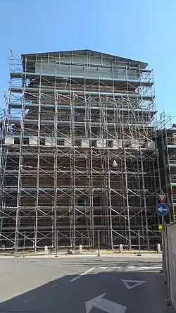 This church, originally staffed by the Jesuit order, was commissioned by Alessandro I Pico when he was invested as Duke, and construction began in 1621 and completed in 1689. The facade remains incomplete and presents a simple brick front. The interior however has elaborate baroque decoration in its single nave. The interiors include an almost Churrigueresque wooden altar and pulpit. The main altar also has a polychrome marble altarpiece of the Circumcision by Innocenzo Monti. By the late 18th century, the expulsion of the Jesuits from the duchy was followed soon after by the Napoleonic invasions. The convent became hospital in 19th century now houses the city library and archives and other offices. The church roof partially fell in after 2012 Northern Italy earthquakes and has been undergoing restoration.[1][2]