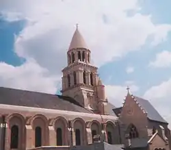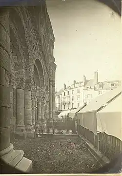 The plan of the church is composed of a central nave with aisles according to a frequent plan in Romanesque architecture of Poitou. The interior has the effect of a "church agora" on just one plane. The barrel vault has a slightly flattened silhouette, whereas the aisles are covered with a groined vault. Outside, the aisles were covered with a terrace punt, the roof being reserved for the nave: thus there was the effect of a basilica on two levels. This silhouette disappeared with the Gothic remodelling. A deambulatory with radiating chapels developed around the church which preserved a part of its murals. A crypt of the 11th century, dug a posteriori under the choir, also preserves frescos of the time. The plan does not have transepts, for good reasons: buildings were in the north, and the principal street passes to the south. The Romanesque gate is preserved in part to the south. Cut down by this stage, one found there before the Revolution, an equestrian statue representing Constantine. This statue was the counterpart of another, older statue destroyed by the Huguenots in 1562. It is not known if the identity of the first rider had been the same. Behind this statue, on the ground, a small vault dedicated to Saint Katherine was referred to during the Middle Ages. The bell-tower dates from the 11th century. In the beginning it was much more obvious: the first level is concealed today by the roofs. Located at the site of the crossing, it presents a square base, then over it a circular level of a roof decorated with tiles. This type of roof, frequent in the south-west, was often copied by the architects of the 19th century, in particular Paul Abadie in Angoulême, Périgueux and Bordeaux.