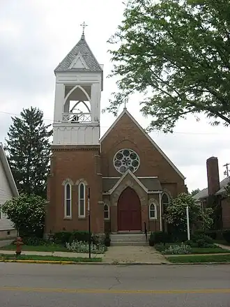 Constructed in 1893,[3]: 513  dedicated in 1894,[4]: 48  and rededicated in 1895,[3]: 513  the Church of Our Saviour is a Gothic Revival structure.[1] In its early years, its pipe organ, brass altar, and windows were deemed its most distinctive elements,[3]: 513  all of which prompted a local author to declare that "both the exterior and interior are very attractive" in 1907.[4]: 48  Built of brick on a stone foundation and featuring elements of wood and stone,[6] the single-story church is covered with a composite roof rising to a central gable. The windows that attracted the attention of authors in the early twentieth century are stained glass; most are ogive windows, but the center of the facade features a rose window. A square brick tower with a wooden belfry sits at one corner of the building; additional stained glass windows are placed in the tower, and ornamental wooden carvings adorn the belfry.[7] Architecturally, it is not unique; three of Mechanicsburg's five historic church buildings were constructed in the 1890s,[8]: 6  and four of the five are brick buildings with stained-glass ogive windows.[8]: 2