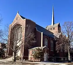 The exterior of the church building consists of red bricks and large blocks of gray stone. Large windows are found both along the transepts and in the front and rear walls, with pointed arches set at wider angles than typical gothic arches (which normally rise to a more dramatic and sharp apex). Stone steps lead up to the main doors of the church, an entrance set within a similarly gentle gothic arch entry, topped with a statue of the Christ the Teacher set in the tympanum. Atop the east narthex doors, a statue of the titular evangelist Saint Mark rests on a pediment above the entrance. A predominantly notable feature of the exterior is its unique six-sided, sharp needle-like spire that rises up from the towered steeple over the sanctuary end of the church, topped with an oxidized copper cross. At one point, the tower contained a belfry and bells. Removed during the second half of the 20th Century, currently it no longer contains bells.